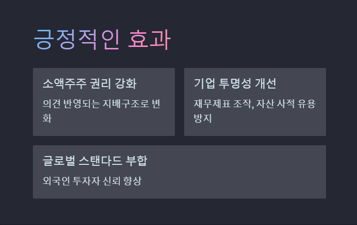첫째, 소액주주의 권리가 실질적으로 강화됩니다. 오너 중심의 경영에서 소액주주의 의견이 반영되는 지배구조로 변화하면서 투자자 신뢰가 높아지게 됩니다.